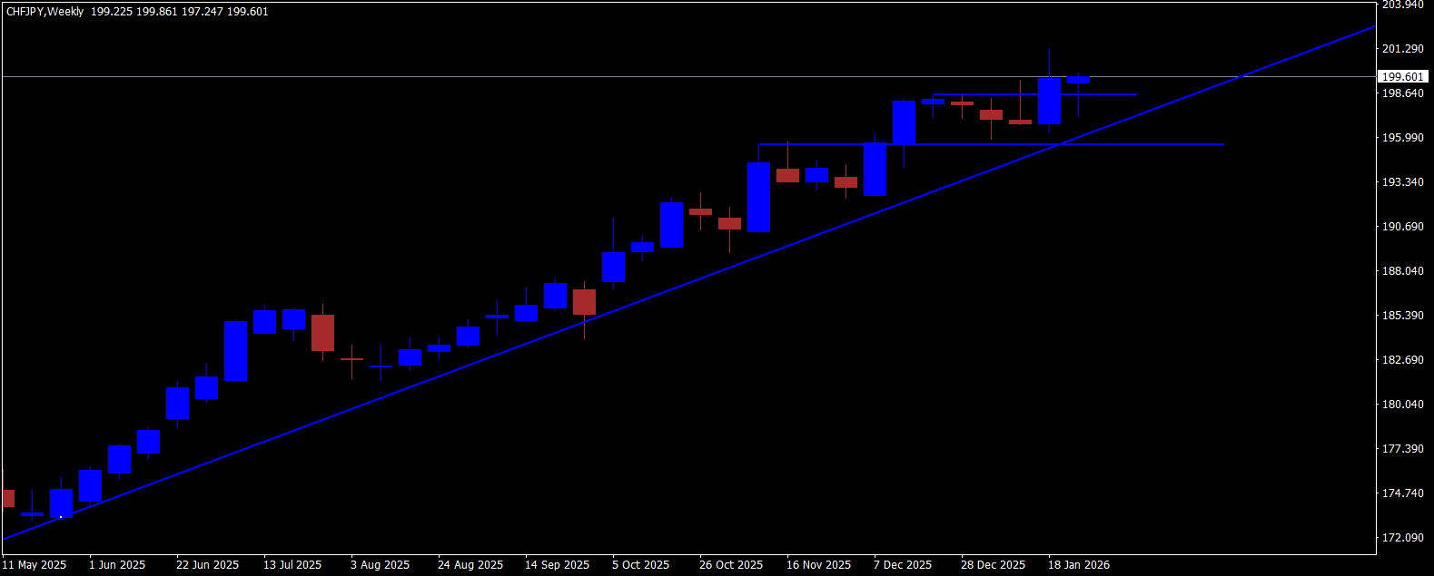 Vývoj měnového páru CHF/JPY na týdenním grafu (W1):
