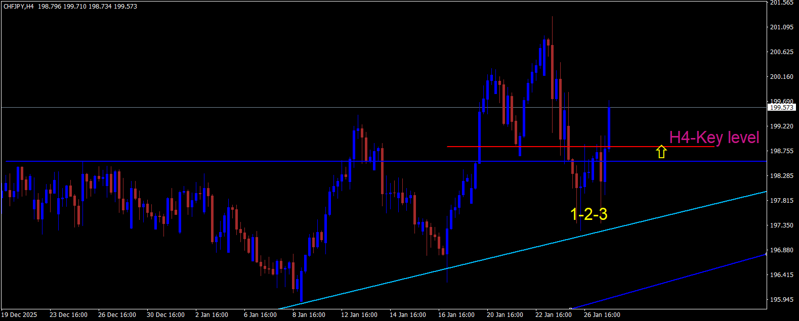 Vývoj měnového páru CHF/JPY na čtyřhodinovém grafu (H4):