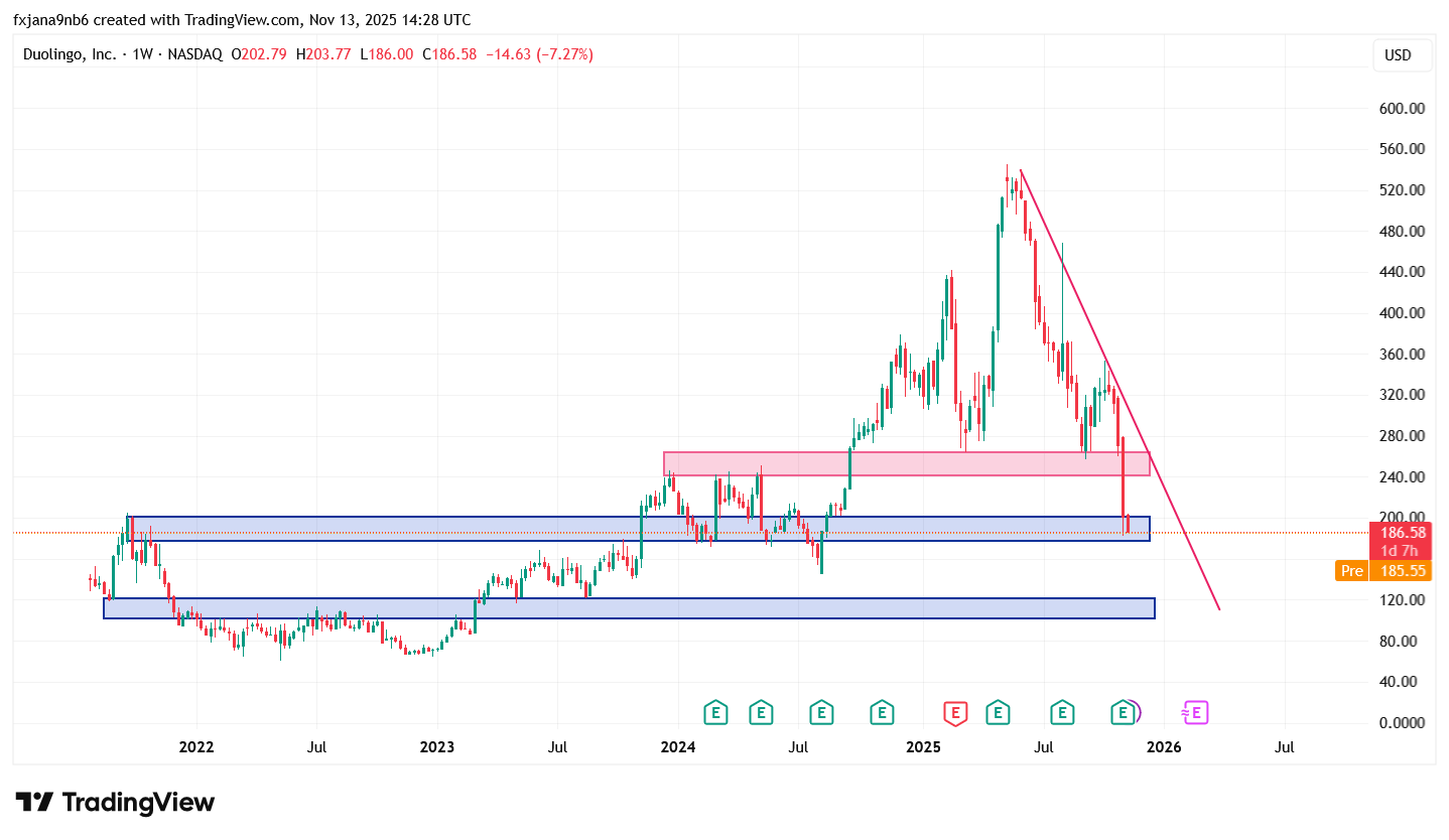 Vývoj ceny akcií firmy Duolingo na týdenním grafu (W1):
