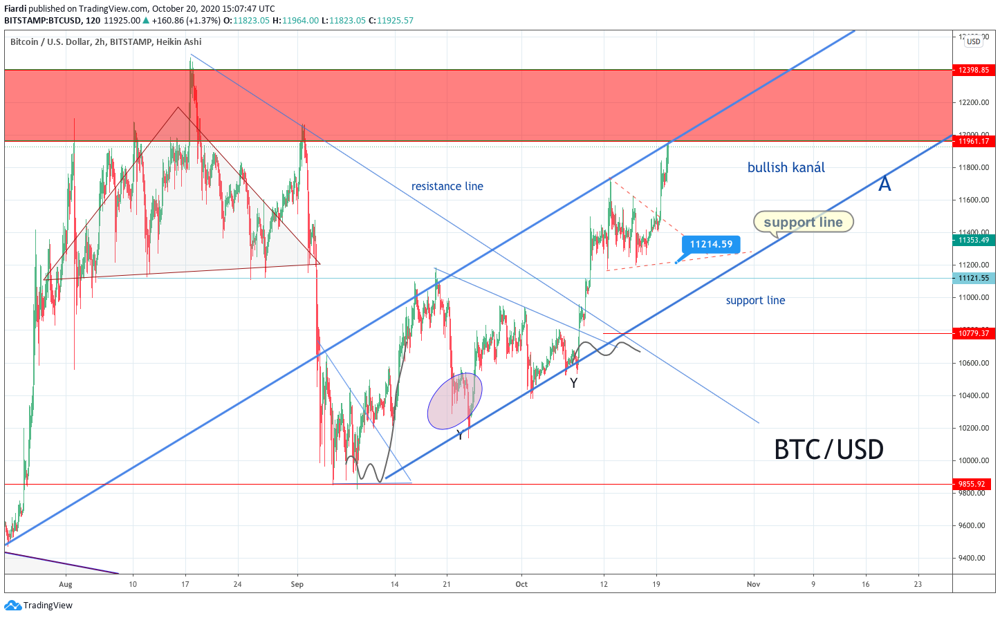 Nejaktuálnější cena za jeden Bitcoin [BTC] je 11 929,20 USD. Bitcoin je kótován na 89 burzách se součtem 400 aktivních trhů. Objem za 24 hodin [BTC] je 15 940 039 786 USD, zatímco tržní kapitalizace Bitcoinu je 220 956 733 226 USD, což jej řadí na první místo všech kryptoměn. Myslím, že je to trochu nečekaný růst. Odraz přišel na hladině 11 200 USD, která momentálně představuje podporu. V rámci grafu se pohybujeme v bullish kanálu. Dost to připomíná (s tím propadem) předešlý triangl a následný růst. Pokud by Bitcoin začal prudce padat, tak se zřejmě zastavíme na support line bullish kanálu na 10 900 USD, odkud se odrazíme směrem k 11 200-11 400 USD, kde jsme nyní. Odpor je na 12 000 USD.
