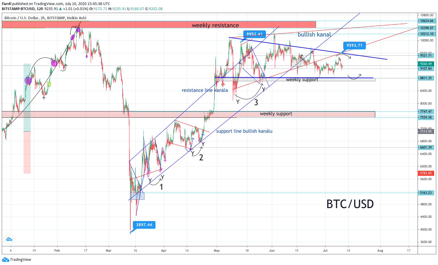 Poslední 3-4 měsíce bývají víkendy slabé. Možná to je tím, že investoři, kteří jsou v kryptoměnách jsou i na Forexu, a tam v pracovní dny obchodují. V pátek jakoby uzavřou své obchody a víkend je volný. Prostě o víkendu to vše mírně poklesne. Na grafu vidíme, jak jsme se dostali těsně k modré linii, což představuje odpor a od ní jsme se odrazili dolů. Nejbližší podpora je v rámci cyklů na 8 800 USD. Nemusíme nutně na 8 800 USD vidět odraz, klidně můžeme být už na 9 000 USD, ale je potřeba být v té oblasti připravený. V rámci ke struktuře trendového kanálu, kterou vidíme, neočekáváme zatím růst nad 9 500 USD, ale zároveň ani propad pod 8 800 USD podporu v následujících 5-7 dnech. V létě ale tato struktura hrozí tím, že to investoři nevydrží a přijde výrazný propad. Ten může být až k 7 700 USD, kde je silnější podpora, proto moje rada je, abyste zvážili momentální nákup BTC až po létě, ale i tyto hodnoty při 9000 USD podle mě neodrážejí cenu po halvingu. Až příchodem podzimu a zimy můžeme znovu růst k 12 až 14 000 USD.