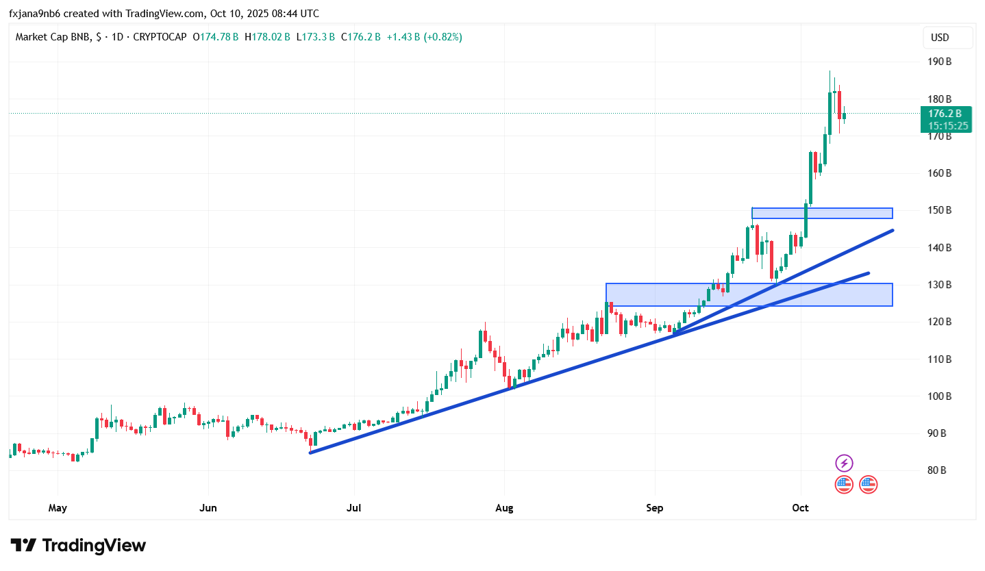 Na začátku října 2025 překročila cena BNB hranici 1 300 dolarů a dosáhla druhého historického maxima během jediného měsíce. Tržní kapitalizace tokenu tak vystoupala na 181 miliard dolarů, čímž BNB předstihl XRP a stal se třetí největší kryptoměnou na světě – hned za Bitcoinem a Ethereem. Tento posun má hlubší význam než pouhé přeskupení pořadí: ukazuje, jak se mění investorské preference směrem k projektům s reálným využitím, stakingem a DeFi aktivitou. Síť BNB Chain totiž zaznamenala rekordní objem transakčních poplatků a vysoký podíl uzamčených tokenů, což potvrzuje její ekonomickou vitalitu. Investoři vnímají tento růst jako signál, že ekosystém Binance dokáže dlouhodobě konkurovat i největším blockchainům světa.