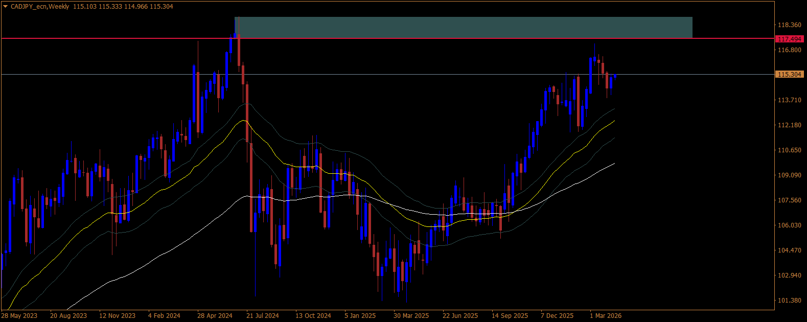 Vývoj měnového páru CAD/JPY na týdenním grafu (W1):