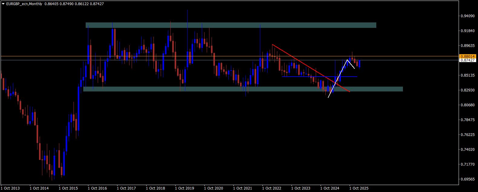 Na měsíčním grafu se cena nachází v široké konsolidaci, která je tvořena již od roku 2016. Tento dlouhodobý boční pohyb vymezuje jasné horní a spodní hranice pásma, mezi nimiž se trh opakovaně pohybuje. Začátkem roku 2025 došlo k odrazu poblíž spodní hranice této konsolidace, po němž následoval volatilní růst směrem ke středovým hodnotám pásma – konkrétně ke středové S/R úrovni.