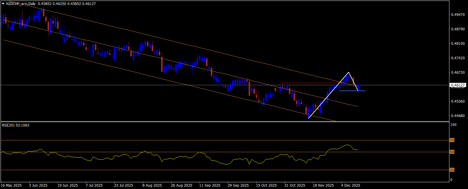 Denní graf NZD/CHF dlouhodobě vykazuje klesající trend, který byl v minulosti definován sérií nižších maxim a nižších minim. V posledním období však došlo k technicky zajímavému vývoji. Cena vytvořila výrazné dno a následně prorazila klíčový rezistenční level, čímž došlo ke změně krátkodobé struktury trhu. Tento průraz byl doprovázen volatilní růstovou vlnou, která narušila dosavadní medvědí charakter trhu.