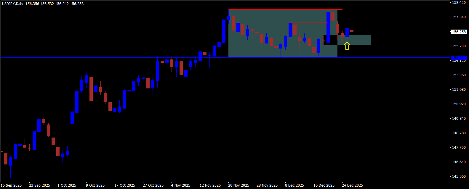 Vývoj měnového páru USD/JPY na denním grafu (D1):