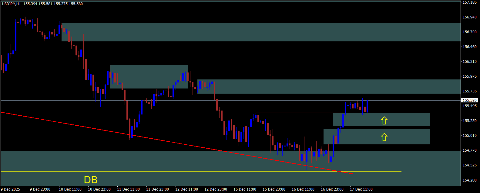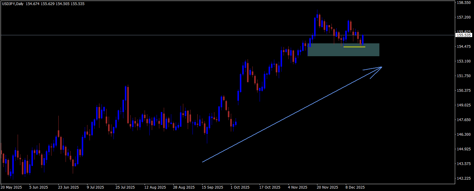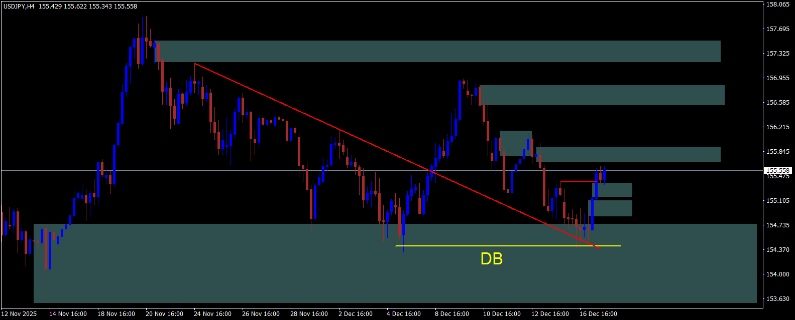Na denním grafu USD/JPY je dlouhodobě patrný rostoucí trend, potvrzený strukturou vyšších maxim a vyšších minim. Po dosažení výrazného maxima v druhé polovině listopadu však následovala korekce, během níž se cena stáhla do oblasti Order blocku, kde došlo ke zpomalení pohybu a přechodu do stranové konsolidace. Další růstový pokus zatím nedokázal překonat předchozí vrchol, což vedlo ke vzniku konsolidační struktury. Aktuálně se na D1 grafu formuje pattern dvojitého dna. Dokončující se svíčka má býčí charakter, uzavírá blízko svého maxima a zároveň vytváří vyšší maximum než předchozí svíčka. Tato kombinace naznačuje možnou změnu krátkodobé struktury trhu a zvyšuje význam sledovaných supportních oblastí. Denní graf tak vytváří základní rámec pro hledání reakce ceny na nižších timeframech.