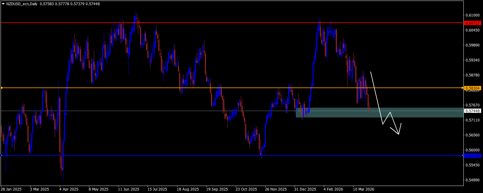 Měnový pár NZD/USD se na denním grafu nadále nachází v klesajícím trendu, který byl v posledních dnech doprovázen přechodem do konsolidační struktury. V rámci této konsolidace došlo v uplynulém týdnu k oslabení, kdy trh prolomil středovou S/R úroveň a potvrdil tak převahu prodejního tlaku. Závěr týdne přinesl uzavření ceny v oblasti order blocku, což naznačuje zvýšený zájem institucionálních hráčů v této zóně. Struktura trhu tak zůstává spíše medvědí, přičemž konsolidace může sloužit jako přípravná fáze pro další pohyb. Klíčovým faktorem bude reakce trhu na případný návrat k proražené úrovni. Pokud dojde k potvrzení nové rezistence, může se otevřít prostor pro pokračování směrem dolů.