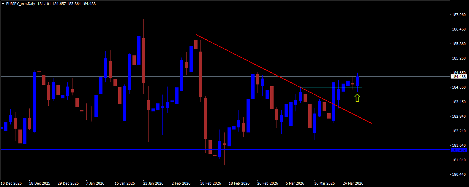Vývoj měnového páru EUR/JPY na denním grafu (D1).
