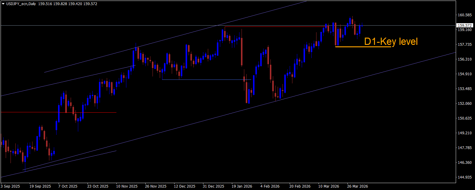 Vývoj měnového páru USD/JPY na denním grafu (D1):