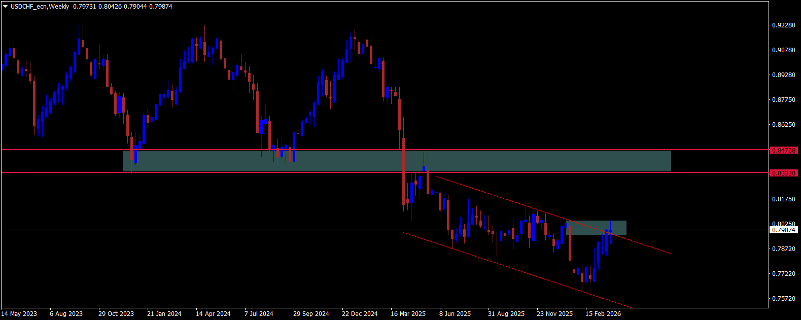 Na měnovém páru USD/CHF je na týdenním grafu nadále patrná dlouhodobá klesající struktura, která byla na začátku dubna 2025 potvrzena průrazem významného supportu a následným formováním klesajícího trendového kanálu. Minimum dosažené koncem ledna vedlo k vytvoření konsolidačního dna, ze kterého trh aktuálně reaguje růstovou korekcí, podpořenou pěti po sobě jdoucími býčími svíčkami. Cena se nyní nachází v klíčové rezistentní zóně tvořené order blockem, v konfluenci s klesající trendovou čarou i horní hranicí kanálu. Tato oblast představuje rozhodující technický bod, kde se bude v následujících týdnech formovat další směr trhu. Potvrzení odmítnutí této rezistence by znamenalo pokračování dominantního downtrendu. Naopak průraz by otevřel prostor pro změnu struktury a potenciální obrat trendu. Prvním signálem návratu k poklesu na nižším timeframe bude pravděpodobně vytvoření nižšího krátkodobého minima.