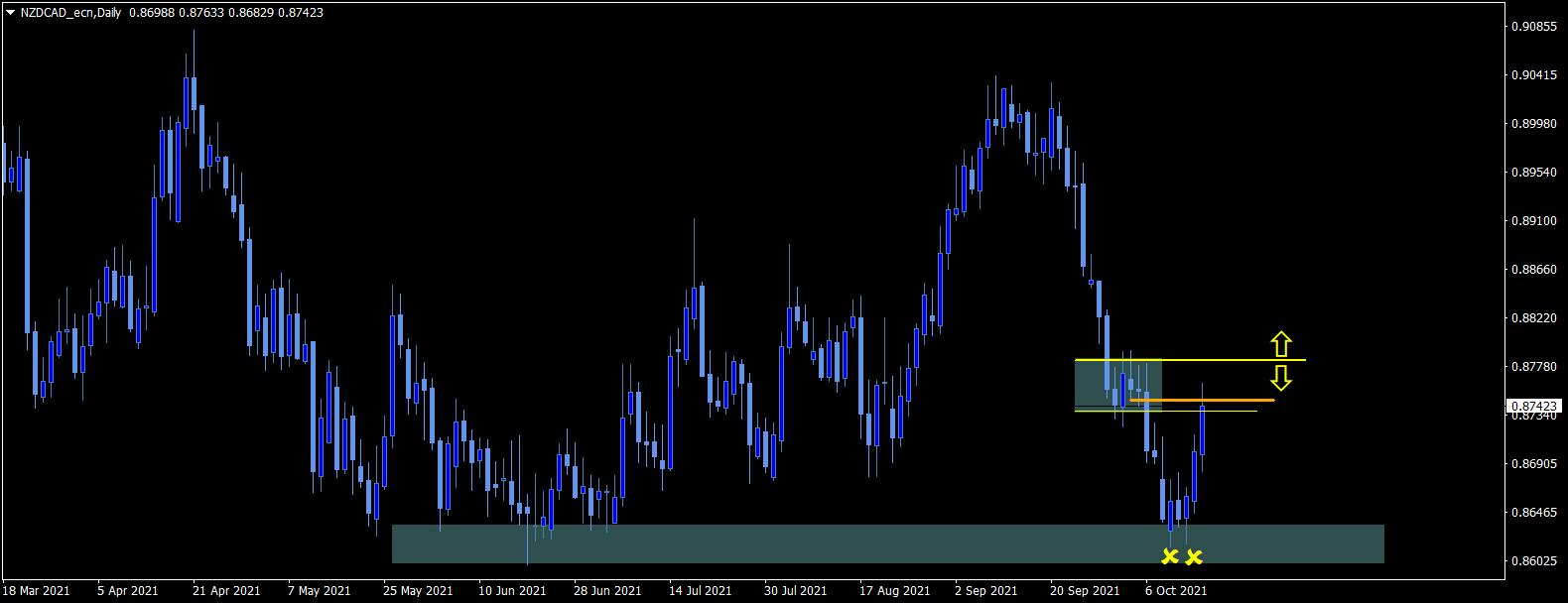 Nepostradatelným nástrojem každého Price Action obchodníka jsou S/R úrovně. Technické indikátory mají své výhody, ale je třeba počítat také s nevýhodami. Nevýhodou oscilátoru RSI je to, že nám sice může ukázat přeprodanou oblast, ale neurčí žádné hranice. Nyní mají slovo S/R úrovně. Na screenshotu dole jsou vyznačeny S/R úrovně pro aktuální situaci. Volatilní korekce vrátila cenu zpět k předchozí konsolidaci. Rezistence 0.8780 je poslední úrovní, která mne v rámci korekce trendu bude v případě dalšího růstu ceny zajímat. Nad touto rezistencí dojde ke ztrátě momenta a pravděpodobně ke změně trendu.