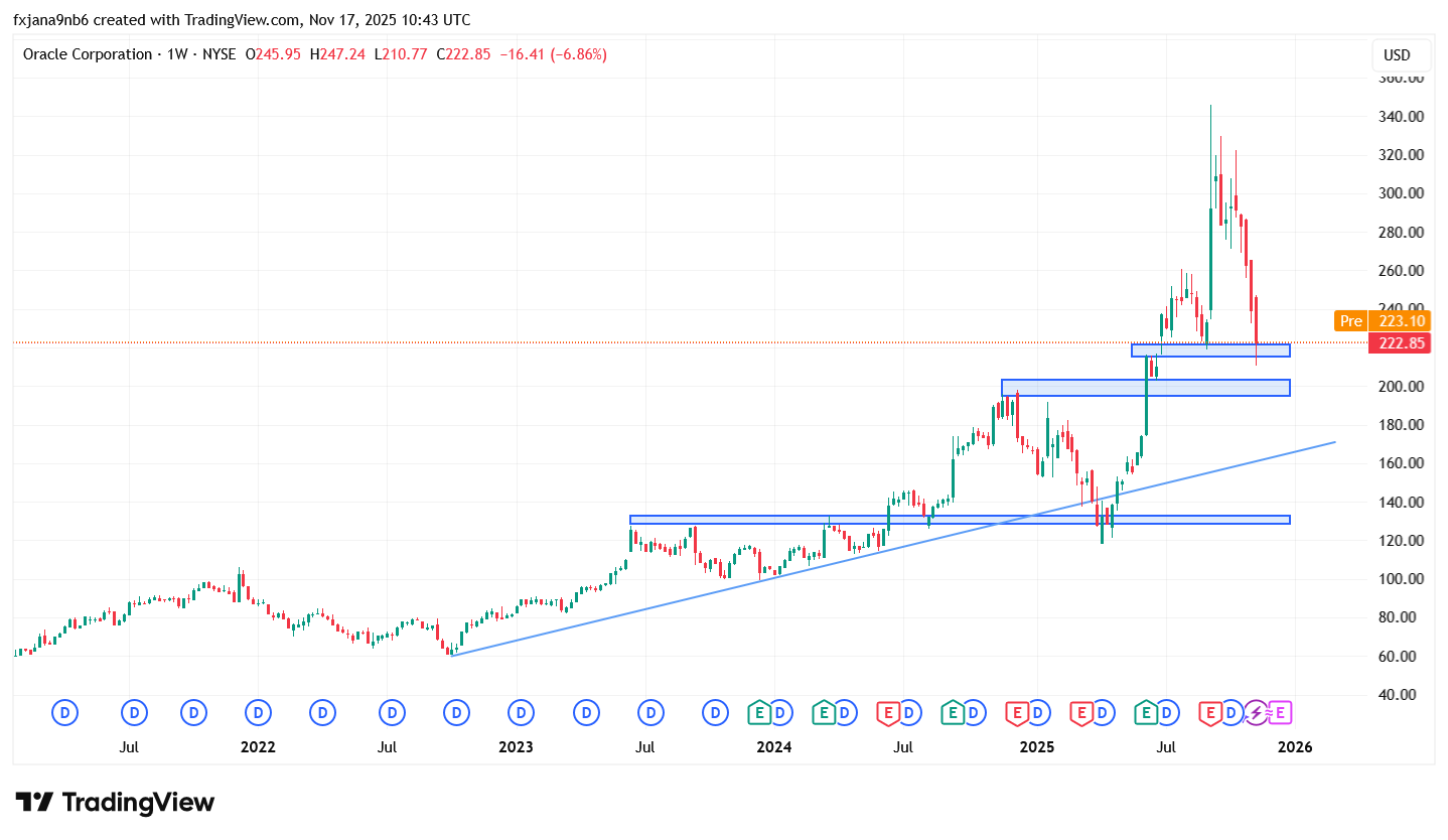 Akcie Oracle mají za sebou výrazné výkyvy. Ještě kolem 10. září 2025 se obchodovaly poblíž historického maxima okolo 340 USD, ale od té doby přišel znatelný pokles a v polovině listopadu 2025 se cena pohybuje přibližně kolem 220 USD. Trh tak výrazně koriguje předchozí euforii kolem rychlého růstu cloudových služeb a AI projektů. Za poklesem stojí hlavně dva faktory: investoři začali pochybovat, zda extrémně rychlý růst cloudu a OCI může pokračovat stejným tempem, zároveň panují obavy z vysokých kapitálových výdajů, které Oracle do rozšiřování cloudové infrastruktury investuje. Přitom poslední dostupné výsledky Q4 FY25 byly stále silné: tržby meziročně rostly o 11 % a firma potvrdila robustní výhled. RPO, tedy objem budoucích objednávek, vyskočil na 138 miliard USD, což ukazuje na silnou poptávku firem po cloudových službách Oracle. Firma navíc vyplácí pravidelnou dividendu 0,50 USD na akcii. Trh se však momentálně zaměřuje spíše na rizika spojená s dalším růstem a na to, že očekávání investorů byla v létě a začátkem podzimu možná až příliš optimistická.