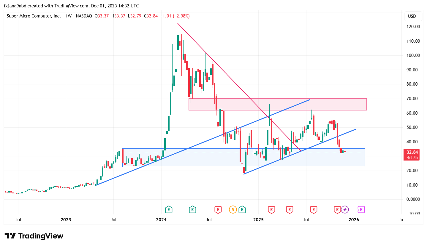 Vývoj cena akcií firmy Super Micro Computer na týdenním grafu (W1):