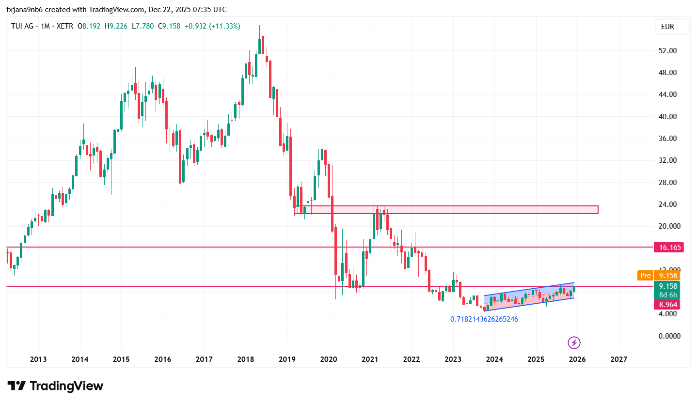Vývoj ceny akcií firmy TUI AG na měsíčním grafu (MN):