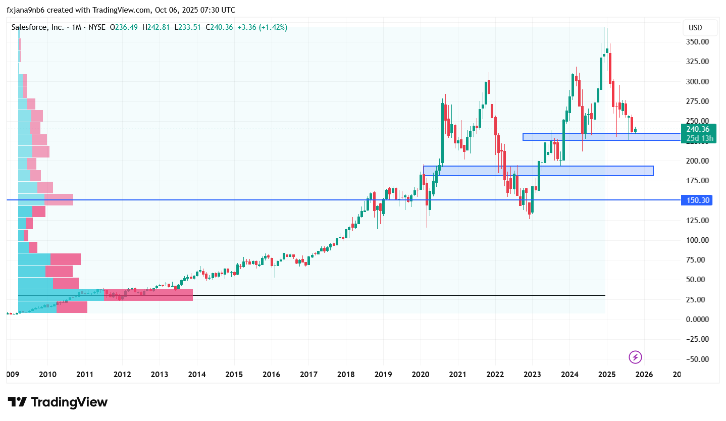 Akcie Salesforce (ticker CRM) za poslední roky prošly dramatickým vývojem. Po pandemickém boomu 2020–2021 přišla korekce o více než 40 %, když se investoři odvrátili od růstových titulů. V roce 2023 se kurz stabilizoval a začal růst díky úsporným opatřením a zaměření na ziskovost. Přesto valuace zůstává vysoká – P/E přes 40 – a trh vyčkává, zda se nová vlna AI produktů promítne i do finančních výsledků. Ve srovnání s indexem S&P 500 si akcie drží nadprůměrnou volatilitu, což z nich dělá zajímavý, ale rizikový titul.