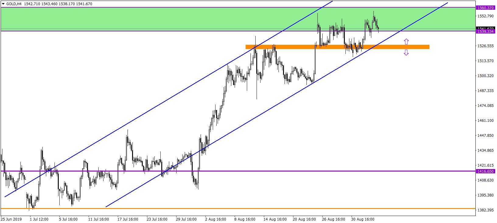 Býčí obchodníci na zlatě připisují pěkné zisky. Před šesti týdny cena zlata opustila dočasnou rezistenci po několikatýdenní konsolidaci. Nyní se nachází o level výše. Mezi cenami 1539 USD a 1560 USD je pásmo rezistence z týdenního časového rámce. Na obrázku dole čtyřhodinový graf zachycuje cenu zlata reagující na tuto rezistenci. Na týdenním grafu bychom mohli vidět reakci v podobě jedné medvědí svíce. Nyní došlo k testu jejího high. Na grafu jsem vyznačil také trendový stoupající kanál a support. V případě, že cena klesne pod support a spodní trendovou čáru stoupajícího trendového kanálu, vidím reálnou možnost nějaké korekce. Nejbližší další support je na ceně 1500 USD