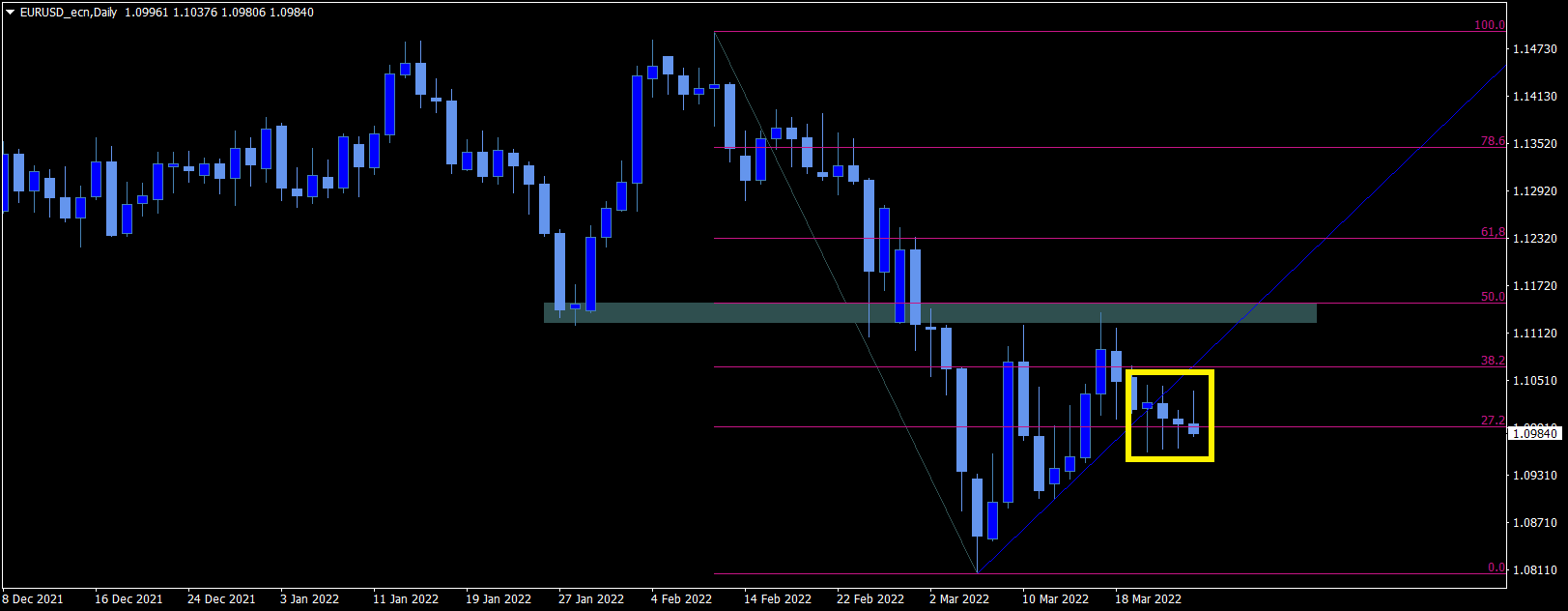 Vypadá to, že na eurodolaru páteční svíčka ukončila mé buy nastavení na nižších časových rámcích a vrací se zpět do hlavního trendu. Aktuálně na denním grafu můžeme vidět klesající trend a dvakrát otestovanou rezistenci 1.1120. Pozvolný pokles přešel do konsolidace. Poslední čtyři svíčky dokončily svíčkový pattern Combo Pinbar. To znamená, že došlo k zakreslení několika inside svíček uvnitř Mother baru a pattern dokončuje svíčka v podobě Pin baru. O tomto svíčkovém patternu se můžete dočíst ZDE.