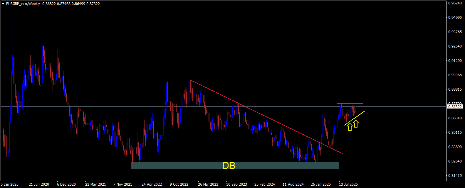 Týdenní graf měnového páru EUR/GBP vykazuje dlouhodobý rostoucí trend, který je podpořen klíčovými technickými strukturami. V minulosti se na cenovém vývoji formovalo dvojité dno, jež posloužilo jako silný support a odrazový bod pro následný růst. Po překonání významné rezistence došlo k potvrzení změny tržního sentimentu směrem vzhůru. Aktuálně trh opět směřuje k testování rezistenční hladiny, která byla dříve prolomena, což naznačuje možný pokus o její potvrzení nebo případné odmítnutí cenou. Ceny vycházejí z formace rostoucího trojúhelníku, která na týdenním rámci indikuje postupné stlačování volatility a konsolidaci cen směrem k potenciálnímu průrazu. Tento pattern často předznamenává pokračování existujícího trendu, což odpovídá současnému technickému kontextu EUR/GBP. Sledování reakce na tuto rezistenci je proto klíčové pro další trendový vývoj.