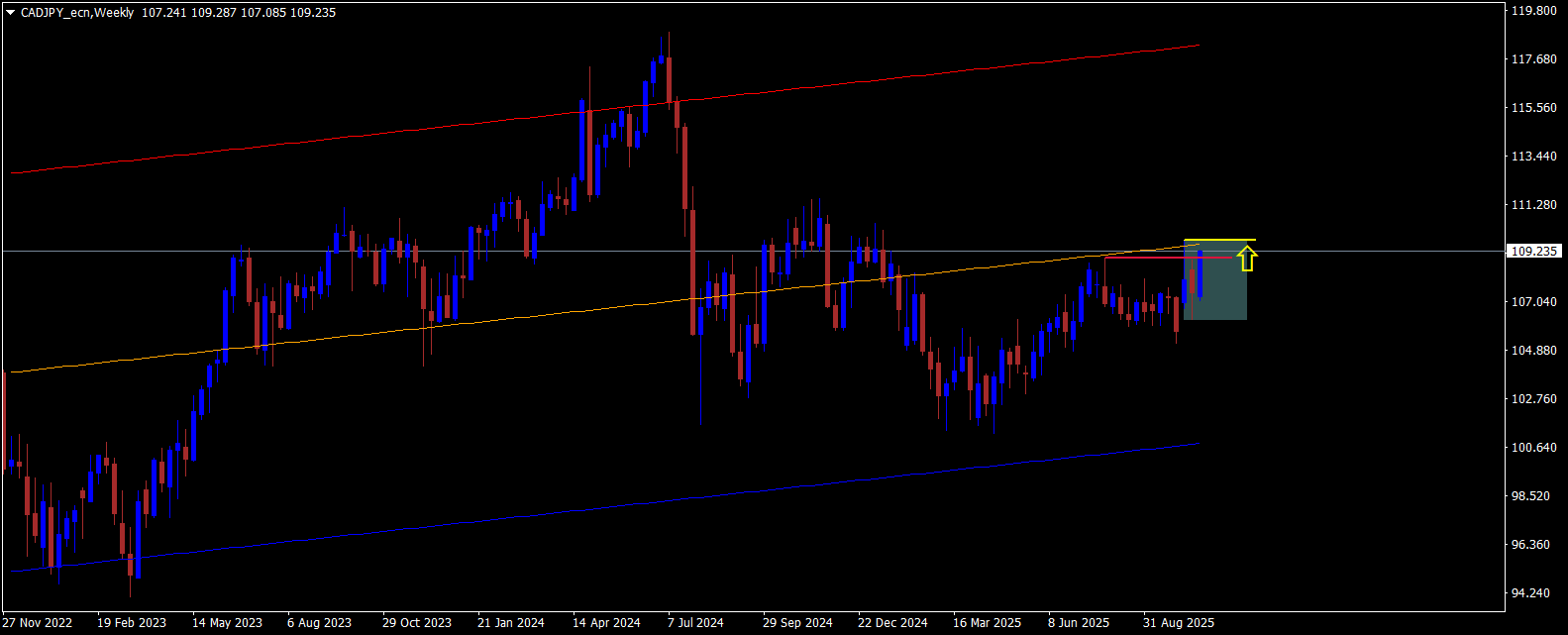 Na týdenním grafu měnového páru CAD/JPY cena stabilně postupuje v rostoucím kanálu, který vytváří jasný trendový rámec pro další pohyb. V nedávné minulosti došlo k dokončení formace dna, což znamená obrat indikující posílení býků a změnu tržního sentimentu. Následně cena otestovala klíčovou střednědobou rezistenci, která představovala významnou bariéru pro pokračování růstu. Aktuálně se trh připravuje na průlom sekundární rezistence, jež se vytvořila po překonání této střednědobé hranice, což může být signálem pro dynamický posun. Proražení vrcholu označeného na screenu níže by mělo potvrdit sílu nákupního tlaku a odstartovat další impulzivní růstový pohyb v rámci rostoucího kanálu. Takový vývoj by potvrdil dominanci býků a otevřel prostor pro postupné navyšování cen v delším horizontu.