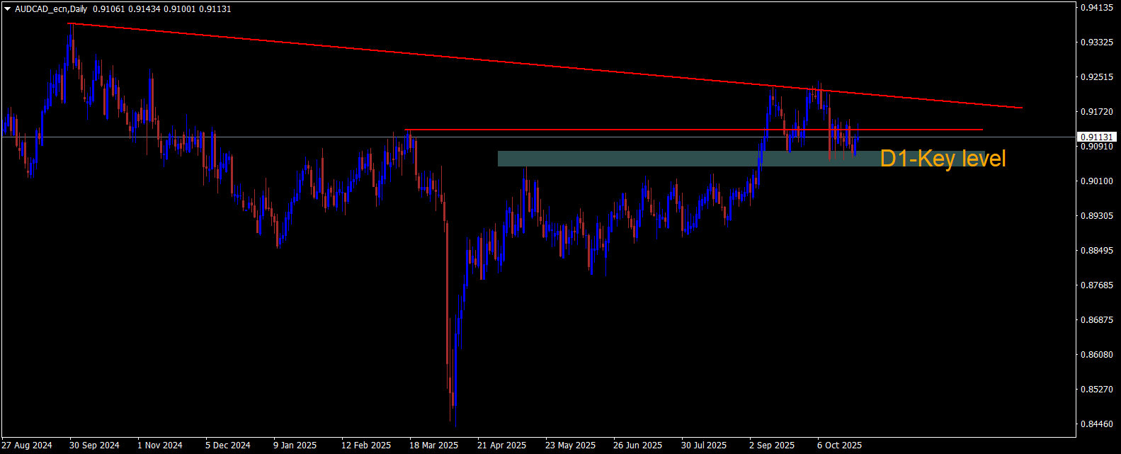 Na denním grafu měnového páru AUD/CAD lze pozorovat konsolidaci, která navazuje na reakci ceny z vyšší časové úrovně, konkrétně z týdenního grafu, kde cena narazila na rezistenci a klesající trendovou čáru, což vyústilo ve formaci medvědí Outside baru. Tento signál následovaly dva inside bary, které indikují oslabení hybnosti a přípravu na rozhodující průlom. Oba patterny společně vytvářejí situaci čekající na potvrzení proražením klíčové hladiny supportu, která je na denním grafu dosud drží. Tento D1-Key level představuje aktuálně silný support a jeho prolomení by mohlo otevřít prostor pro další medvědí vývoj. Pro tradery je zajímavý zejména možný pullback po průrazu, který by potvrdil změnu tržního sentimentu a nabídl vhodný vstup do pozice. Celkově se situace jeví jako potenciálně výnosná pro strategii založenou na proražení a následné korekci.