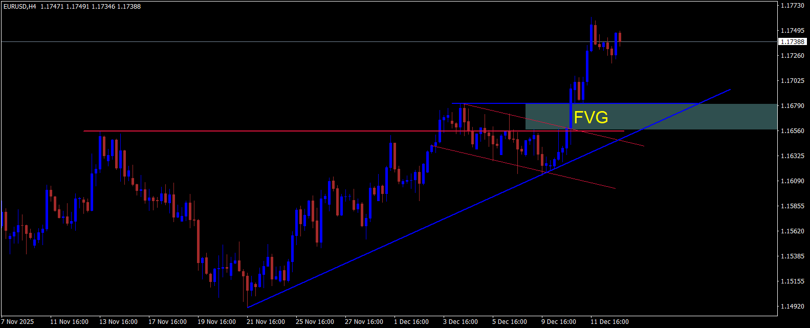 Na vyšších časových rámcích došlo v minulosti k překonání významného W1-Key levelu ze spodní strany, což signalizovalo změnu dlouhodobější struktury trhu. Přechod nebyl impulsivní, ale proběhl pozvolně formou konsolidace typu vlajka, jejíž horní hranice byla proražena až následně s vyšší volatilitou. Denní graf aktuálně ukazuje dvě silné býčí svíčky, po nichž následoval páteční nízkovolatilní Inside bar, naznačující krátkodobé vyčkávání trhu. Na H4 se tímto vývojem vytvořila konfluencní zóna složená z rostoucí trendové čáry, supportu tvořeného bývalým vrcholem a vyznačeného FVG. Tato oblast představuje technický prostor zájmu pro případné pokračování trendu.
