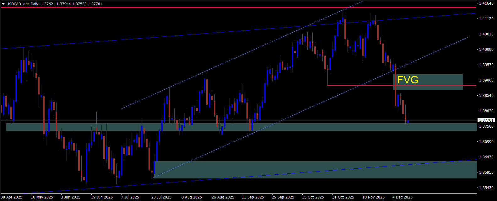 Aktuálně trh testuje významnou S/R úroveň, na níž v minulosti opakovaně reagoval. Price Action během poklesu zahrnovala mikrokonsolidaci a následný break medvědím outside barem, po němž přišla další silná medvědí svíčka. Páteční svíčka pokles zastavila jako býčí, s delším horním stínem, což může naznačovat prostor pro korekční růst. Potenciálním cílem korekce může být oblast FVG v blízkosti rezistence tvořené jedním z minulých minim, byť jde o relativně vzdálený cíl vyžadující negaci několika denních svíček.