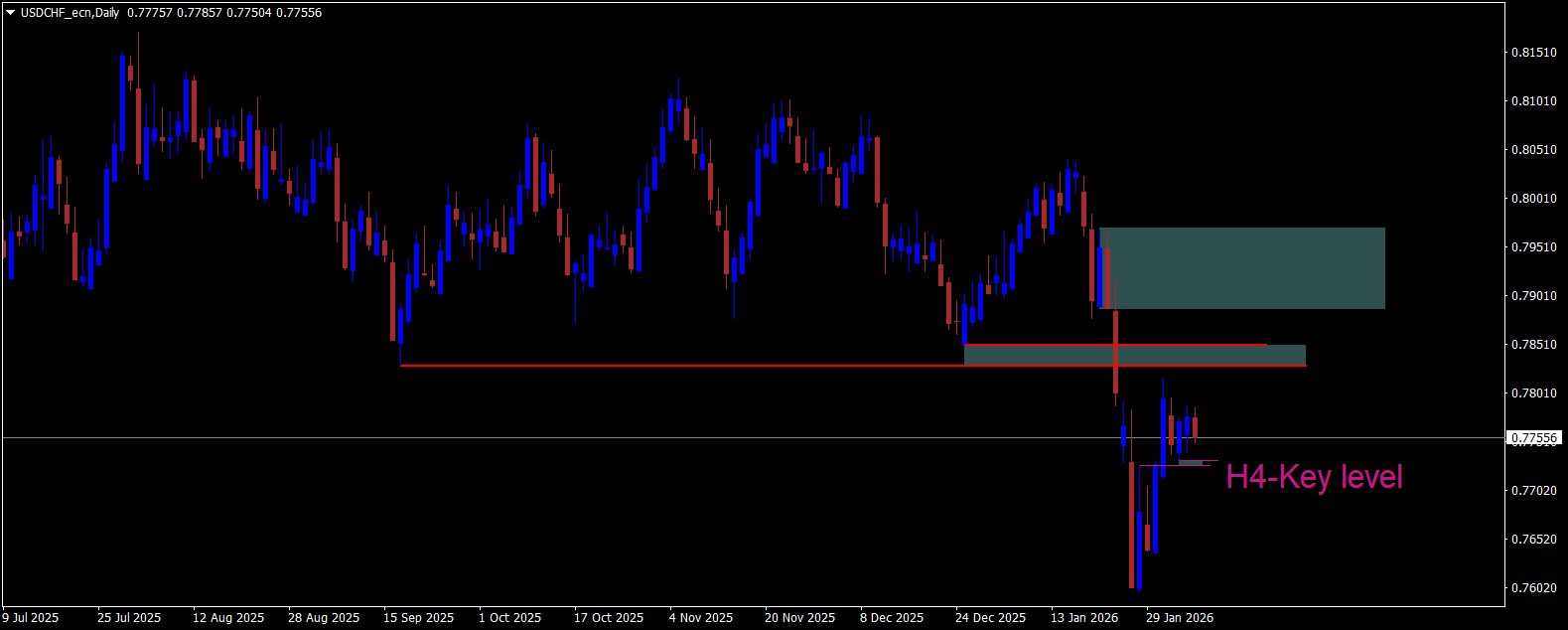 Pár zůstává v klesajícím trendu. Po breaku významného supportu došlo k dynamickému výprodeji, který potvrdil převahu medvědů. Aktuálně sledujeme korekční pohyb proti hlavnímu směru. Minulý týden vytvořil vícenásobný Inside bar, což značí kompresi volatility a přípravu na silnější pohyb.