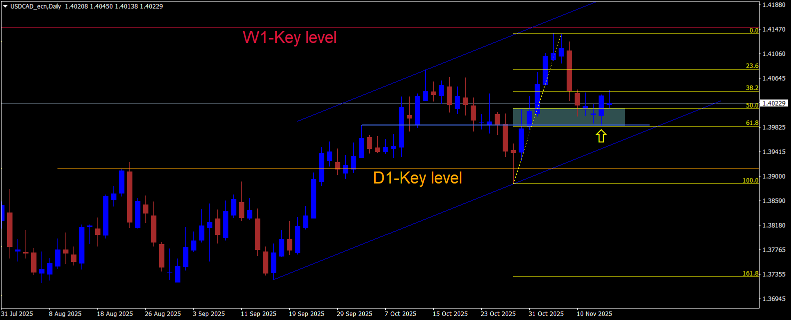 Vývoj měnového páru USD/CAD na denním grafu (D1):