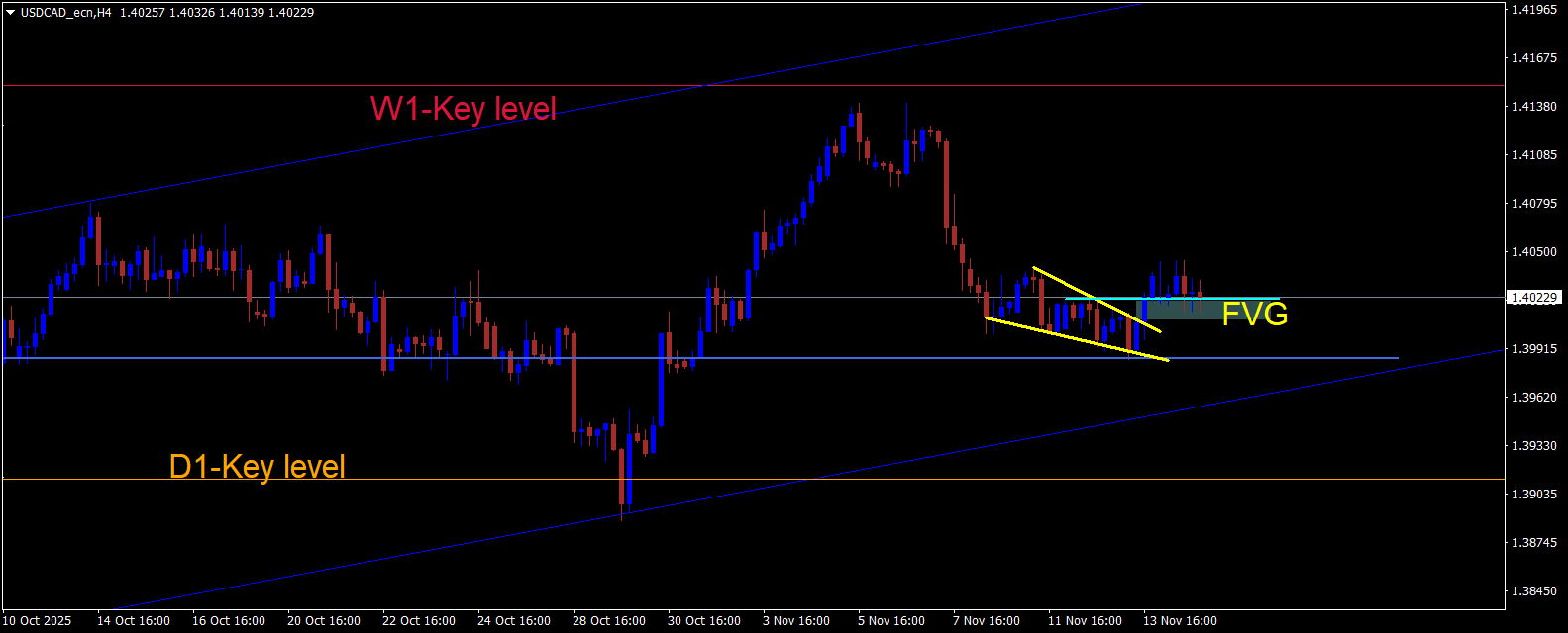 Na čtyřhodinovém grafu USD/CAD je dobře patrný detail širší denní struktury, kde cena prorazila klesající klín, čímž potvrdila ukončení předchozí korekční fáze. Po breaku se trh přesunul do úzké konsolidace, která naznačuje akumulaci a přípravu na další pokračování pohybu ve směru vyššího trendu. Pod aktuální cenovou strukturou se nachází výrazný Order block, jenž poskytuje stabilní podporu a zvyšuje pravděpodobnost opětovného převzetí iniciativy kupci. Celkové uspořádání technických prvků tak favorizuje možnost růstu, přičemž rozhodující bude reakce trhu na hranici konsolidace. Rizikem zůstává nízká volatilita typická pro pondělní seance, kdy trh často pouze vyčkává na vstup hlavních účastníků. Pokud je nutné obchodovat, smysl dává až aktivita během newyorské seance, kdy se pravděpodobně objeví první relevantní pohyb.