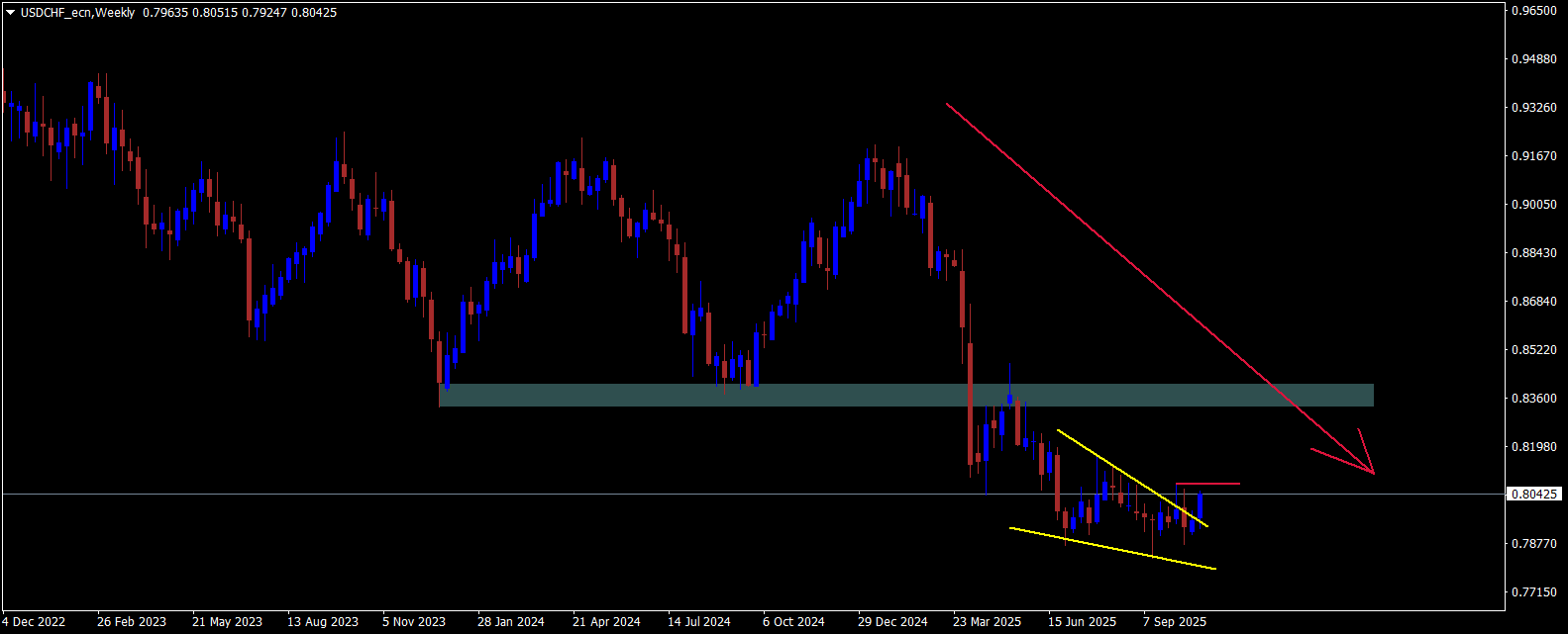 Na týdenním grafu měnového páru USD/CHF je patrný dlouhodobý klesající trend, který byl nedávno vystaven výrazné volatilitě v důsledku průlomu klíčové supportní úrovně. Tento průlom vyvolal prudký pokles ceny, který ovšem generoval tvorbu formace klesajícího klínu, jež často signalizuje potenciální obrat trendu nebo alespoň korekční růst. Vzhledem k této technické konstrukci je pravděpodobná následná cenová reakce směrem vzhůru, která by mohla částečně kompenzovat předchozí propad. Hlavním technickým limitem pro další vývoj bývají rezistentní úrovně definované jako W1-Key level, které představují zásadní bariéru pro pokračování růstového pohybu. Traderům se proto doporučuje pečlivě sledovat cenovou akci v okolí těchto rezistencí, jelikož její reakce zde může naznačit další směr trhu v následujících týdnech.