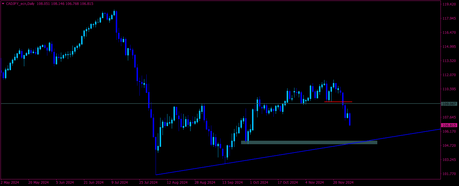 Na denním grafu měnového páru CAD/JPY sledujeme situaci následující po volatilním výprodeji, viditelném na vyšších časových rámcích. Po tomto výprodeji cena na nějakou dobu přešla do rostoucího trendu, který vytrvale stoupal. Tento růst se zastavil na úrovni předchozího dna, což je často klíčová oblast odporu, kde se rozhoduje o dalším směřování ceny.