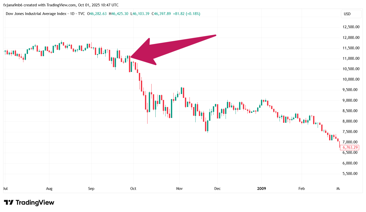 30. září 2008 – Nejhorší září pro S&P 500 od roku 1931 O den později burzy pokračovaly v klesajícím trendu. Index S&P 500 uzavřel září 2008 s celkovým poklesem o 9,1 %, což byl nejhorší zářijový výsledek od roku 1931, tedy období Velké hospodářské krize. Investoři ztratili důvěru v bankovní systém i regulační orgány a nejistota se odrážela v extrémní volatilitě. Firmy čelily problémům s refinancováním, kreditní trhy prakticky zamrzly a investoři hledali bezpečí v amerických vládních dluhopisech. Tento moment potvrdil, že finanční krize se změnila v plnohodnotnou hospodářskou hrozbu. Pro burzu to byl další historický mezník, který bude navždy spojován s rokem 2008.