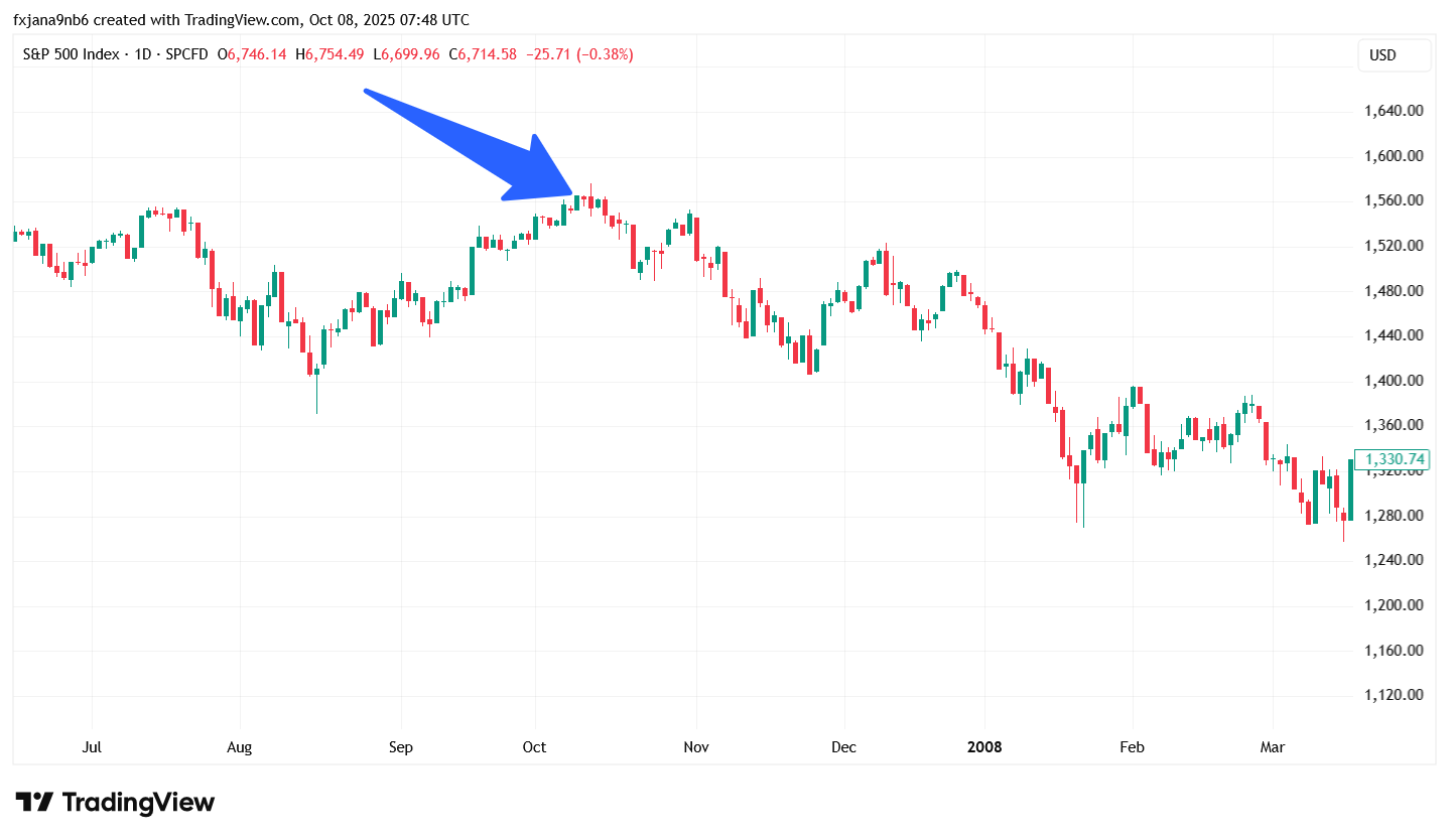 Dne 9. října 2007 uzavřel index S&P 500 na rekordním maximu 1 565 bodů. Jen o rok později se svět ponořil do nejhlubší finanční krize od roku 1929. V té době se zdálo, že americká ekonomika je nezastavitelná, trhy poháněla levná likvidita a boom hypoték. Málokdo tušil, že právě tehdy bublina na trhu s nemovitostmi dosáhla svého vrcholu. O několik měsíců později padaly první investiční banky a v září 2008 zkrachoval Lehman Brothers. Z dnešního pohledu je říjen 2007 považován za symbol vrcholu euforie, která předchází kolapsu.