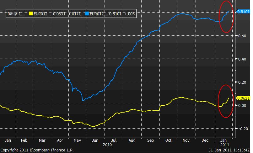 Následující graf (vpravo nahoře) zachycuje rozdíl mezi 12 měsíčními eurovými sazbami a sazbami na 12 měsíční dolarové a librové půjčky. Jak plyne z obrázku, rozdíl mezi eurovými a librovými sazbami se v lednu rozšířil na 0,06 %, zatímco rozdíl mezi eurovými a dolarovými sazbami vzrostl na 0,81 %, což je ještě více, než začátkem listopadu, kdy americká centrální banka definitivně rozhodla o zahájení druhého kola kvantitativního uvolňování.
