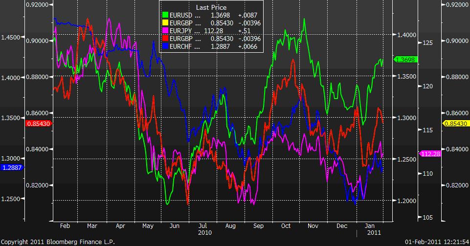 Očekávaní rychlejšího růstu sazeb v eurozóně a rozšiřování úrokového diferenciálu, tak bylo v lednu jednoznačně hlavním motorem růstu evropské měny a velmi reálným faktorem, který stál za jejím zpevněním. Euro v lednu dokázalo posílit vůči dolaru o 2,45 % až na cenu 1,3698 EURUSD, zatímco k libře zpevnilo o 0,2 % k ceně 0,8543 EURGBP.