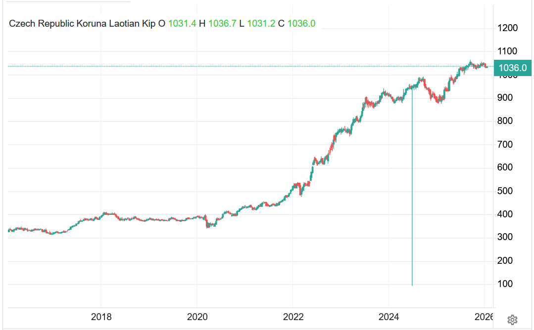Vývoj kurzu české koruny vůči laoskému kipu – CZK/LAK (týdenní časový rámec):