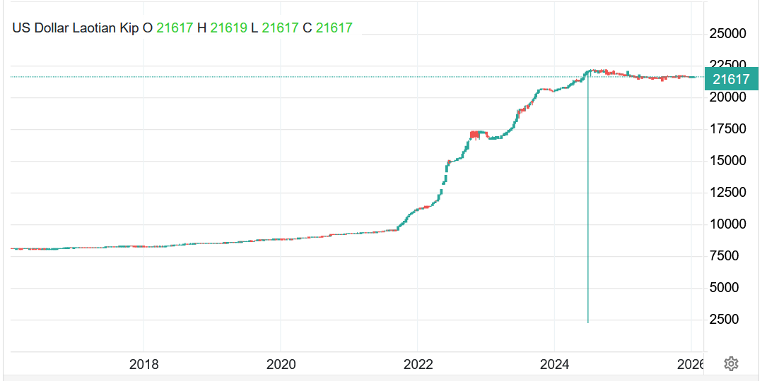 Vývoj kurzu amerického dolaru vůči laoskému kipu – USD/LAK (týdenní časový rámec):