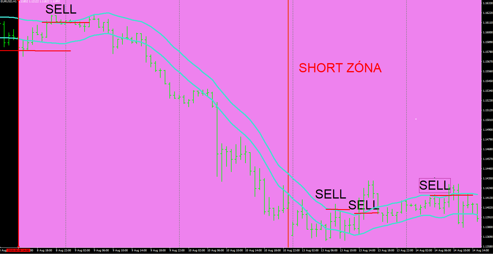 Tímto je určen směr a dále postupujeme na H1 time-frame. Zde vstupujeme na odrazech od indikátoru ENVELOPES (osahuje ho každá platforma MetaTrader a používáme základní nastavení), v případě nákupů od dolní linie indikátoru, v případě prodejů od horní linie indikátoru.