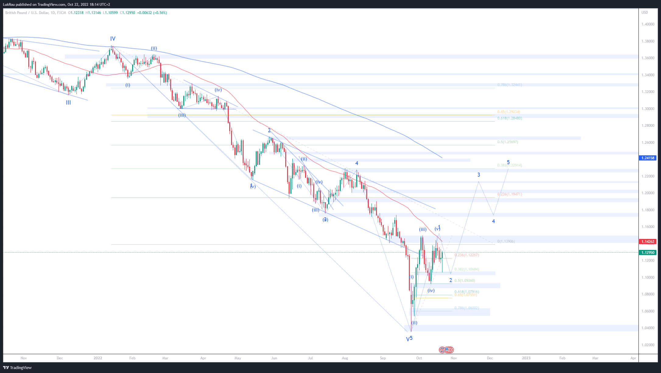 Měnový pár GBP/USD zdá se utvořil zkrácenou poslední vlnu (v) a vydal se do korekce. Tato korekce přesně zasáhla 38,2 % Fibonacciho retracementu pro tuto impulsní vlnu (i) až (v). Můžeme tedy pokládat tuto korekci jako ukončenou, což ale nevylučuje, že bychom se mohli podívat ještě o něco níže. Pokud by GBP/USD prorazil konec této impulsní vlny 1 na úrovni 1,1465 směrem vzhůru, jednalo by se o potvrzení dalších rostoucích ambicí tohoto měnového páru a dal by se očekávat růst směrem k úrovni 1,2255.