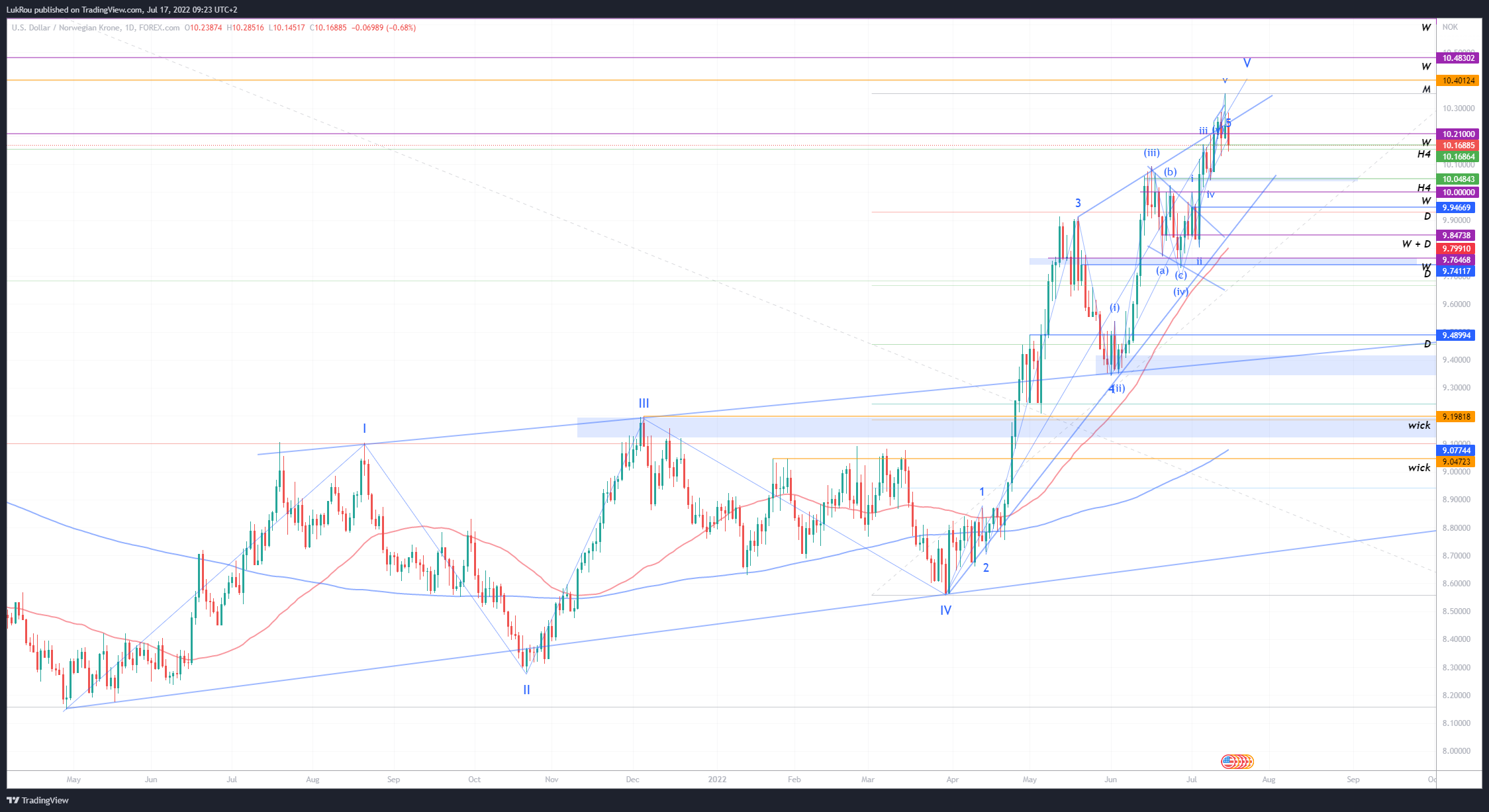 Měnový pár USD/NOK zasáhl důležitou úroveň z týdenního grafu 10,21. Ze začátku se pohyboval mírně nad ní, ale ve výsledku poklesl opět pod ní, kde na konci týdne uzavřel. Při propočtu vln se zdá, že máme kompletní poslední podvlnu a čeká nás pokles na nižší hodnoty. Je důležité mít na paměti, že po tak dlouhém růstu by mohlo dojít také k prodloužení poslední vlny a je důležité se tím nenechat zaskočit. Pokud je toto, ale opravdu konec vlny V, očekával bych pokles někam k S/R úrovni 9,76 a pak dále až na 9,48. Pokud síla poklesu vydrží, mohli bychom se podívat až na zajímavé hodnoty kolem 9,19.
