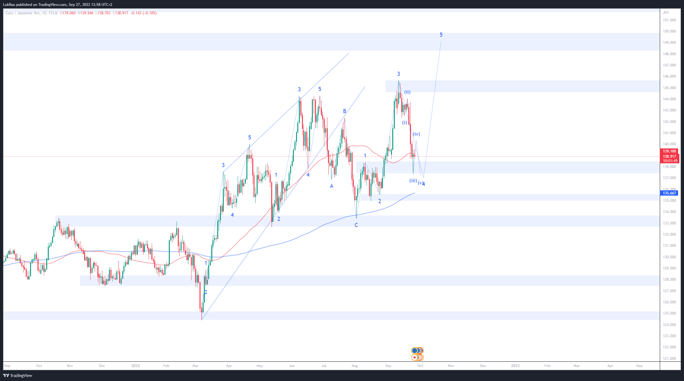 Měnový pár EUR/JPY zdá se tvoří novou impulsní vlnu 1 až 5. Aktuálně to vypadá, že se EUR/JPY nachází v korekční vlně 4, která by mohla vytvořit ještě jednu nižší vlnu (v) před tím, než se vydá do vlny 5. Teoreticky může být tato korekce ve vlně 4 u konce, protože by se mohlo jedna pouze o korekci abc. EUR/JPY by pak ve vlně 5 mohl zamířit k proražení konce vlny 3 a potencionálně dosáhnout úrovně 148,85 a odtud se pak odrazit ke korekci této impulsní vlny.