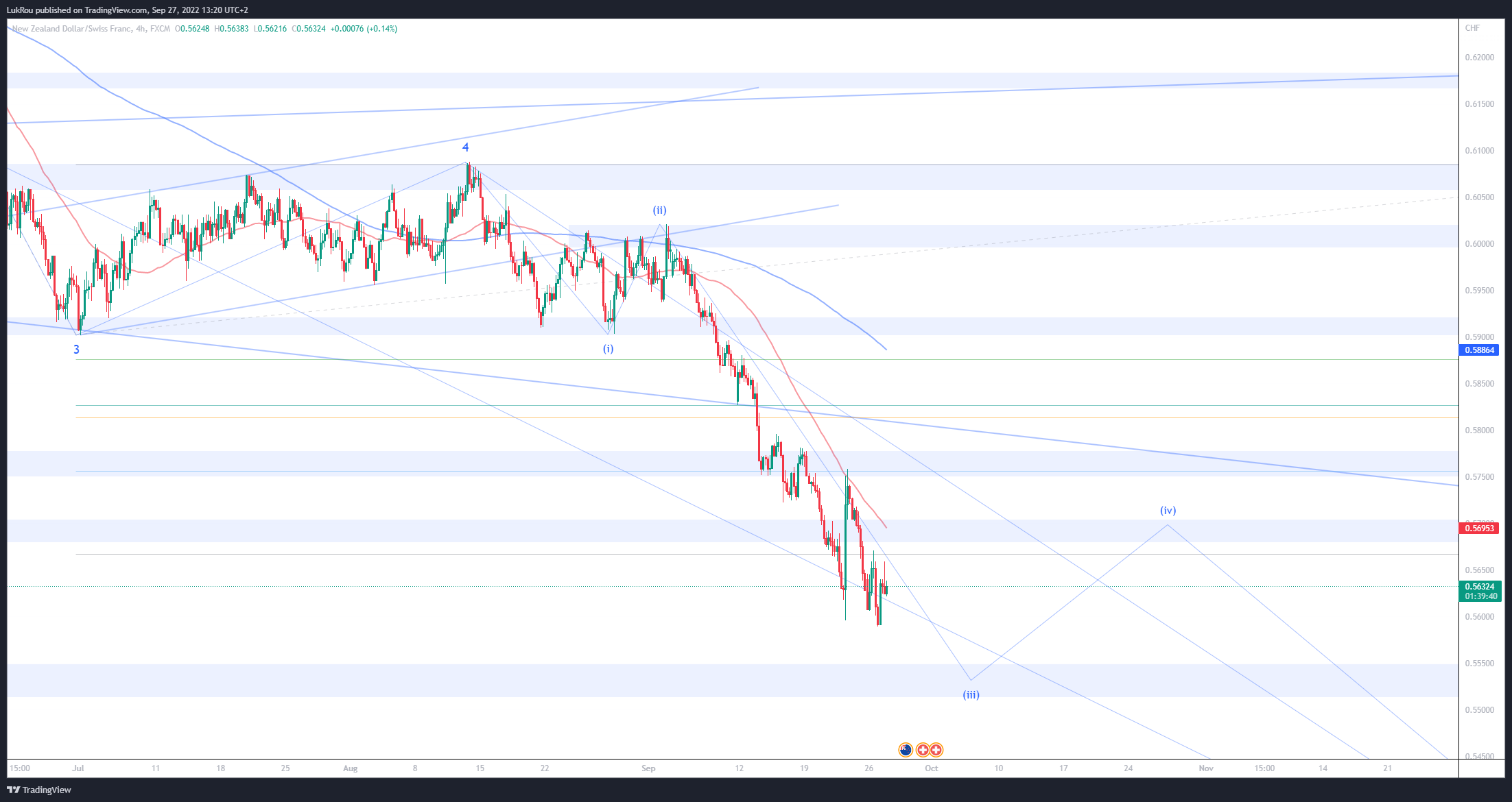 Měnový pár NZD/CHF pokračuje ve vytrvalém poklesu, kde můžeme identifikovat impulsní vzor 1 až 5 a ve vlně 5 bychom si mohli označit vlny (i), (ii) a (iii). V současné době se pohybujeme ve vlně (iii), kde je ovšem obtížné určit jakýkoli počet vln k určení toho, kde by mohla vlna (iii) končit. S jistou pravděpodobností můžeme jen říci, že vlny 1 a 3 jsou přibližně stejně dlouhé, což by napovídalo, že vlna 5 bude prodloužená. Mohla by tak klidně pokračovat až na 161,8 % Fibonacciho extenze na ceně 0,5400 a v okolí se následně odrazit, ke korekci tohoto dlouhodobého poklesu.