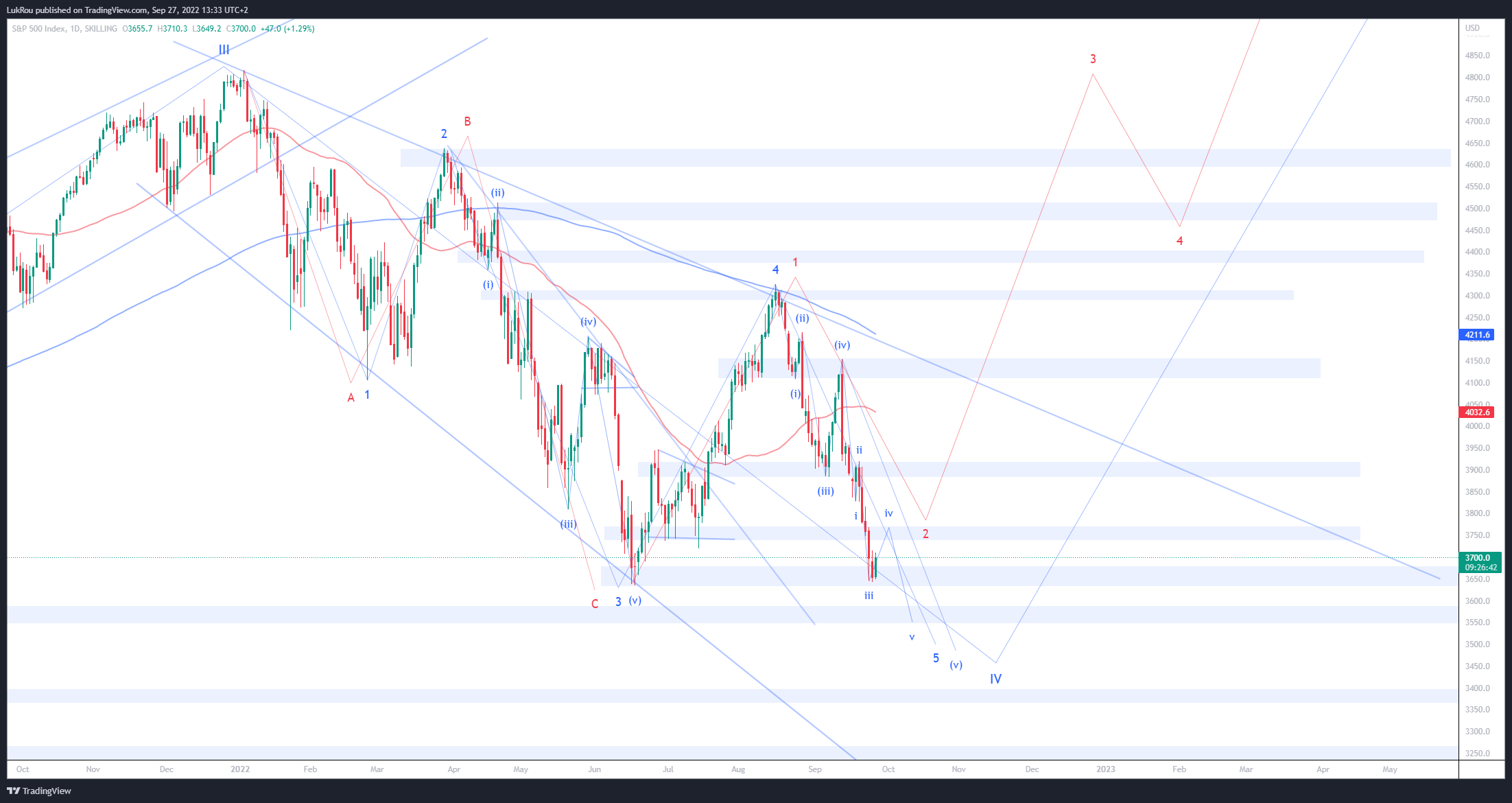 Index S&P 500 dále ve vlně (v) pokračoval v poklesu a dostal se velmi blízko low na ceně 3634 USD, čímž by se dalo říci, že znegoval moji předchozí teorii (červeně), kterou bylo nutno přehodnotit. Aktuálně to vypadá, že se budeme ubírat ještě o něco níže, protože vlna (v) stále nemá kompletních pět vln. V grafu si můžeme aktuálně označit pouze vlny i, ii a iii, kde by měly následovat ještě vlny iv a v. Celkově bychom mohli klesnout na úroveň 3565 USD, ale není vyloučeno, že zamíříme až na další úroveň 3380 USD. Celkově by se ale mohlo jednat o konec této dlouhodobé korekce a tento index by mohl zamířit směrem vzhůru.