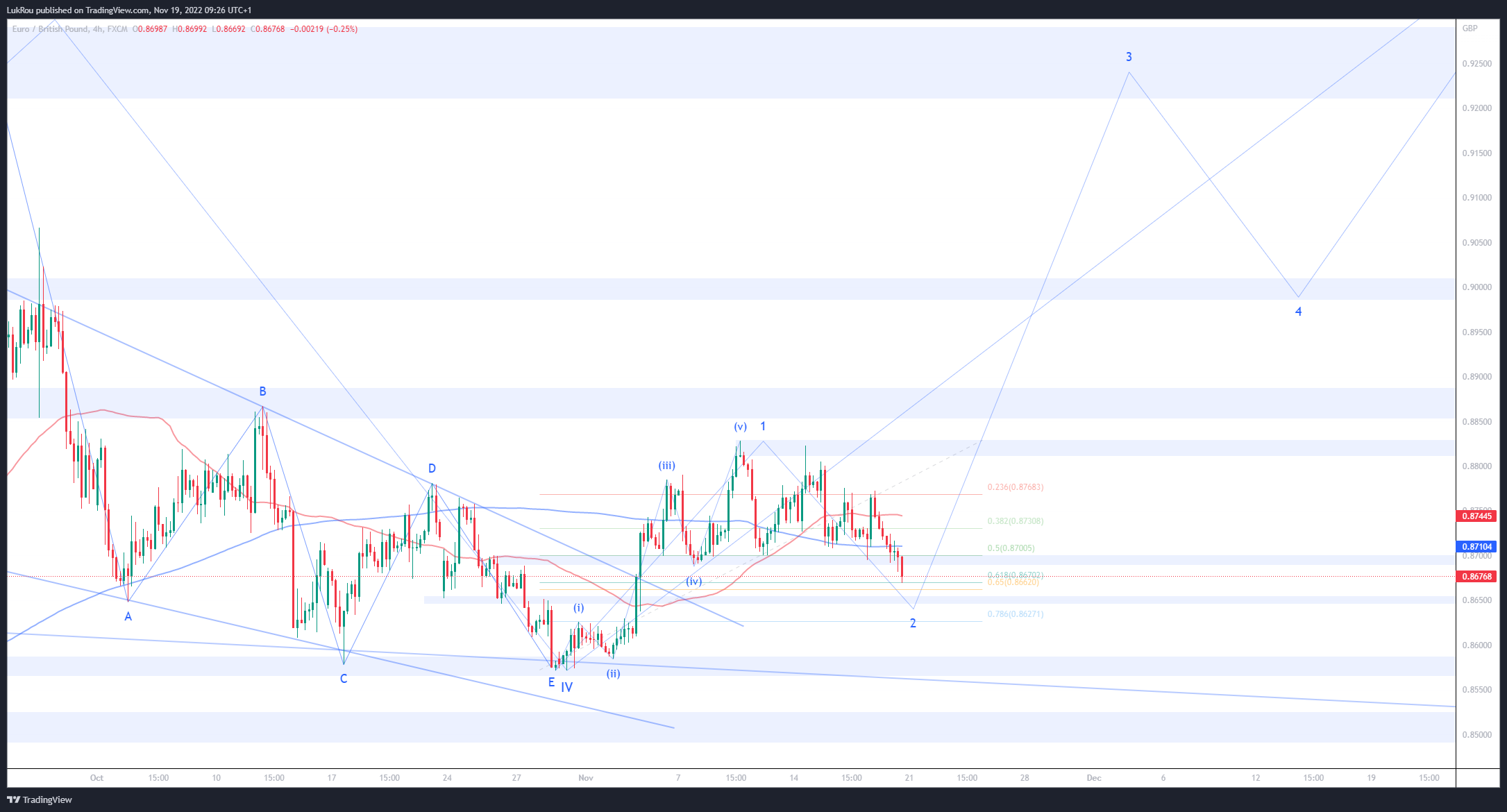 Měnový pár EUR/GBP dokončil podle očekávání vlnu 1 a vydal se do korekce ve vlně 2, kde se aktuálně nacházíme. Cena se aktuálně pohybuje poblíž 61,8 % Fibonacciho retracementu pro vlnu 1 a mohla by ještě lehce poklesnout až k úrovni 0,8652, odkud by se mohla odrazit do vlny 3. Vzhledem ke složitosti vlny 2 je těžké najít v ní nějakou formaci, ze které by se dalo těžit. Potvrzení toho, že se cena vydala do vlny 3 bude ve chvíli, kdy cena prorazí konec vlny 1. To by pro mě osobně byl hlavní signál. Ve vlně 3 bychom mohli zamířit až k úrovni 0,9250, kde by mohla být vlna 3 ukončena.