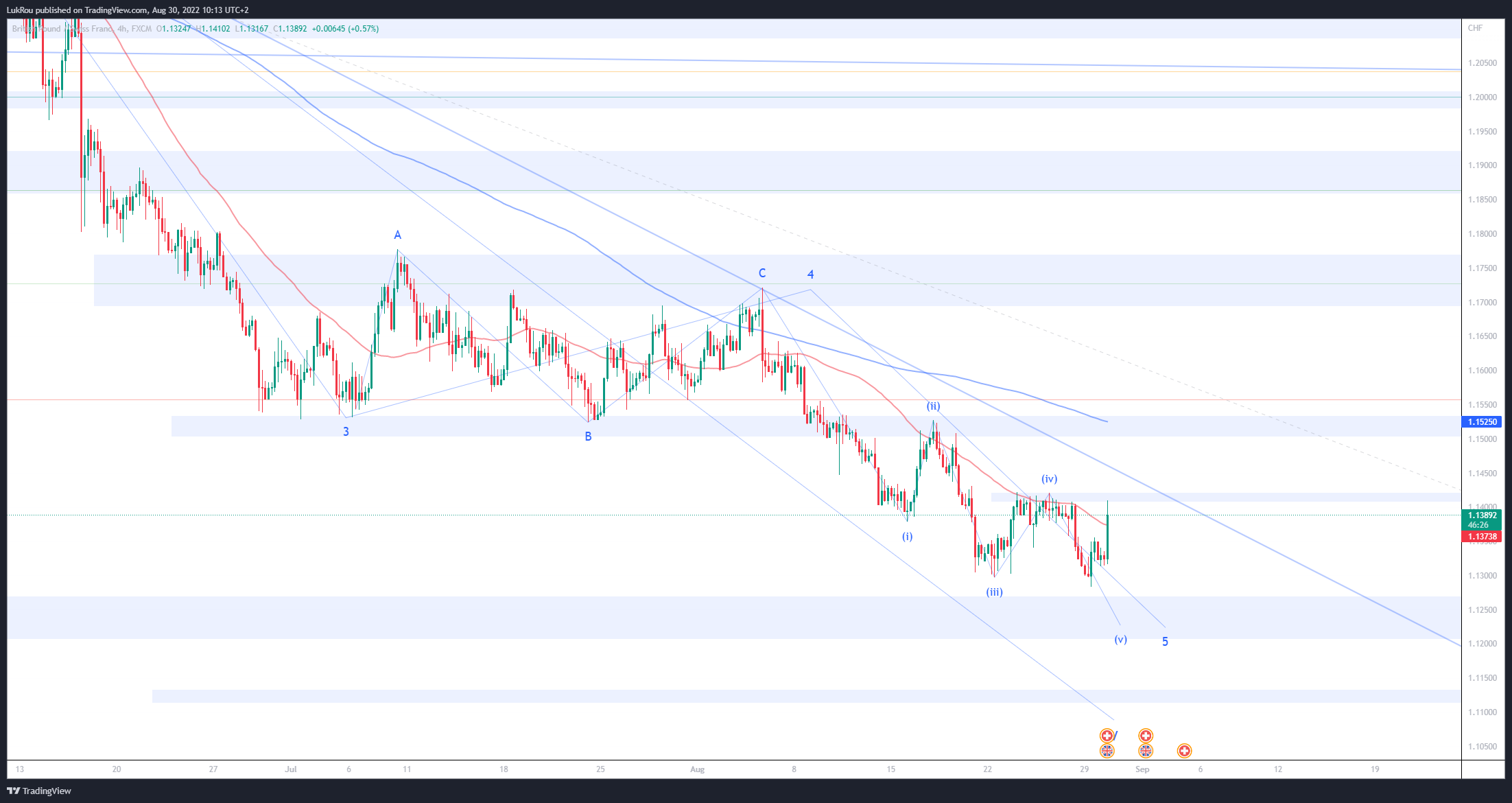 Měnový pár GBP/CHF se zatím nedostal do cílové zóny pro dokončení vlny 5 a (v), ale podle reakce z posledního low se zdá, že by se mohlo jednat o dokončení této impulsní vlny. Pokud tedy cena prorazí konec vlny (iv) a současně klesající trendovou linii, kterou definují konce vln 2 a 4, jednalo by se o potvrzení, že by impulsní vlna 1 až 5 mohla být u konce. Cílem tohoto růstu pak bude 38,2 % Fibonacciho retracementu pro vlnu 1 až 5 na ceně 1,1727.