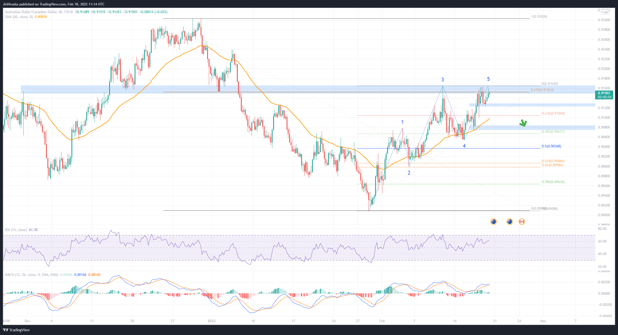 Obchodní příležitost na měnovém páru AUD/CAD ze dne 18.02.2022 nebyla aktivována, protože měnová pár pokračoval dále v růstu a pátá vlna se ukázala jako prodloužená. Z toho důvodu zveřejněné obchodní nastavení již není platné. Počet vln dle Elliottovy teorie musím být upraveno. Cena se dostala až na Fibonacciho retracement 78,6 %, kde definitivně ukončila pátou vlnu. Vytvořila korekci ve formě vln A a B a nyní to vypadá, že se tvoří vlna C, která by mohla končit v úrovni 38,2 % Fibonacciho retracementu nebo níže na 50,0 % Fibonacciho retracementu, který se shoduje s extrémem vlny 4. Toto by mohla být velmi zajímavá obchodní příležitost. Technické indikátory RSI a MACD jsou spíše medvědí a nahrávají tomuto scénáři.