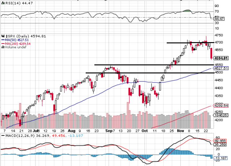 V pondělí index S&P 500 ještě vystoupal na nové intradenní maximum. Před Dnem díkůvzdání následovaly dva klasicky nudné dny s malou obchodní aktivitou. V pátek ale index prolomil support v pásmu 4 650 až 4 630, kde byla minima druhého listopadového týdne, čímž se přiblížil k důležitému supportu v zóně 4 550 až 4 500, který je zesílený 50denním klouzavým průměrem. V případě prolomení této podpory (poklesu o další 2 %) by se denní graf indexu posunul do medvědího nastavení. Další podmínkou této změny by bylo opakované uzavření pod 4 500.