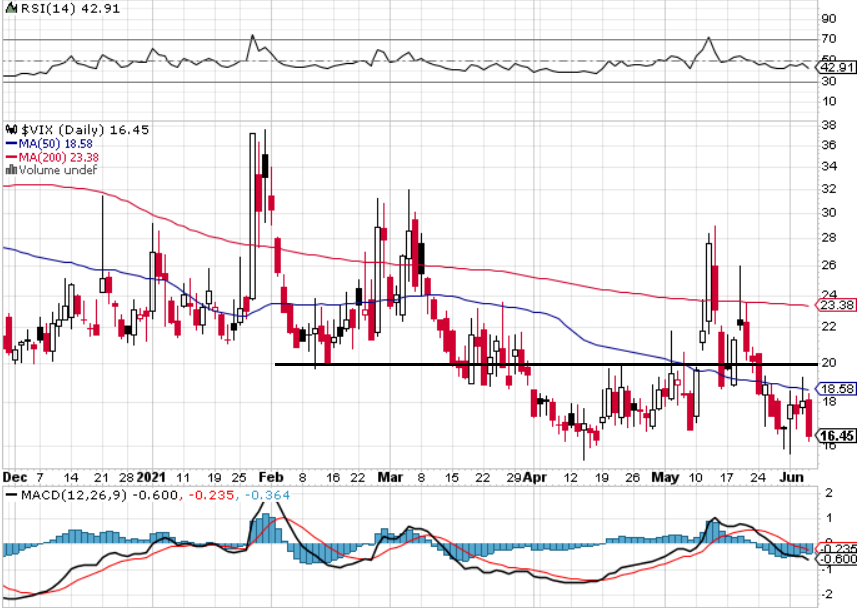 Index volatility VIX (takzvaný index strachu, který měří rozkolísanost trhu) je v blízkosti letošních minim a pod klouzavými průměry. Pro akcie tak vysílá optimistický signál.