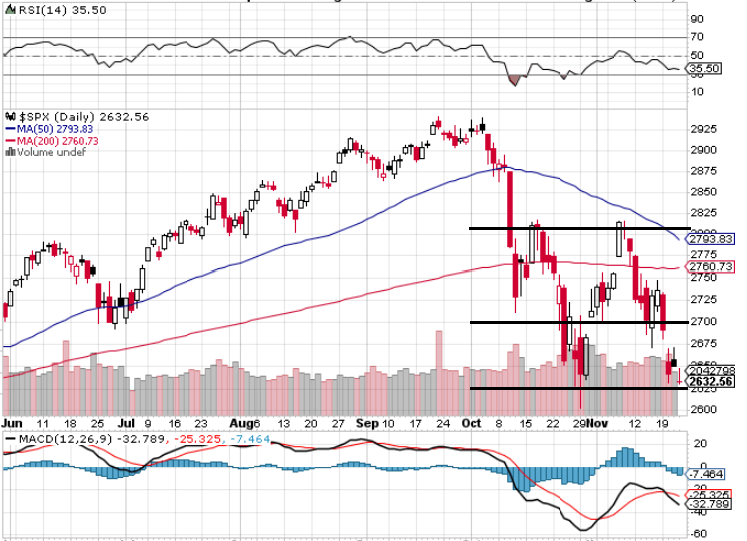 Index S&P 500 prolomil support 2 700 hned v pondělí a sunul se níže až pod nejnižší říjnové zavírací ceny. Po říjnové ztrátě přes 6 % odepisují akcie v listopadu před jeho posledním týdnem bezmála 4 %. V posledních dnech se index propadl i do mínusu od začátku roku.